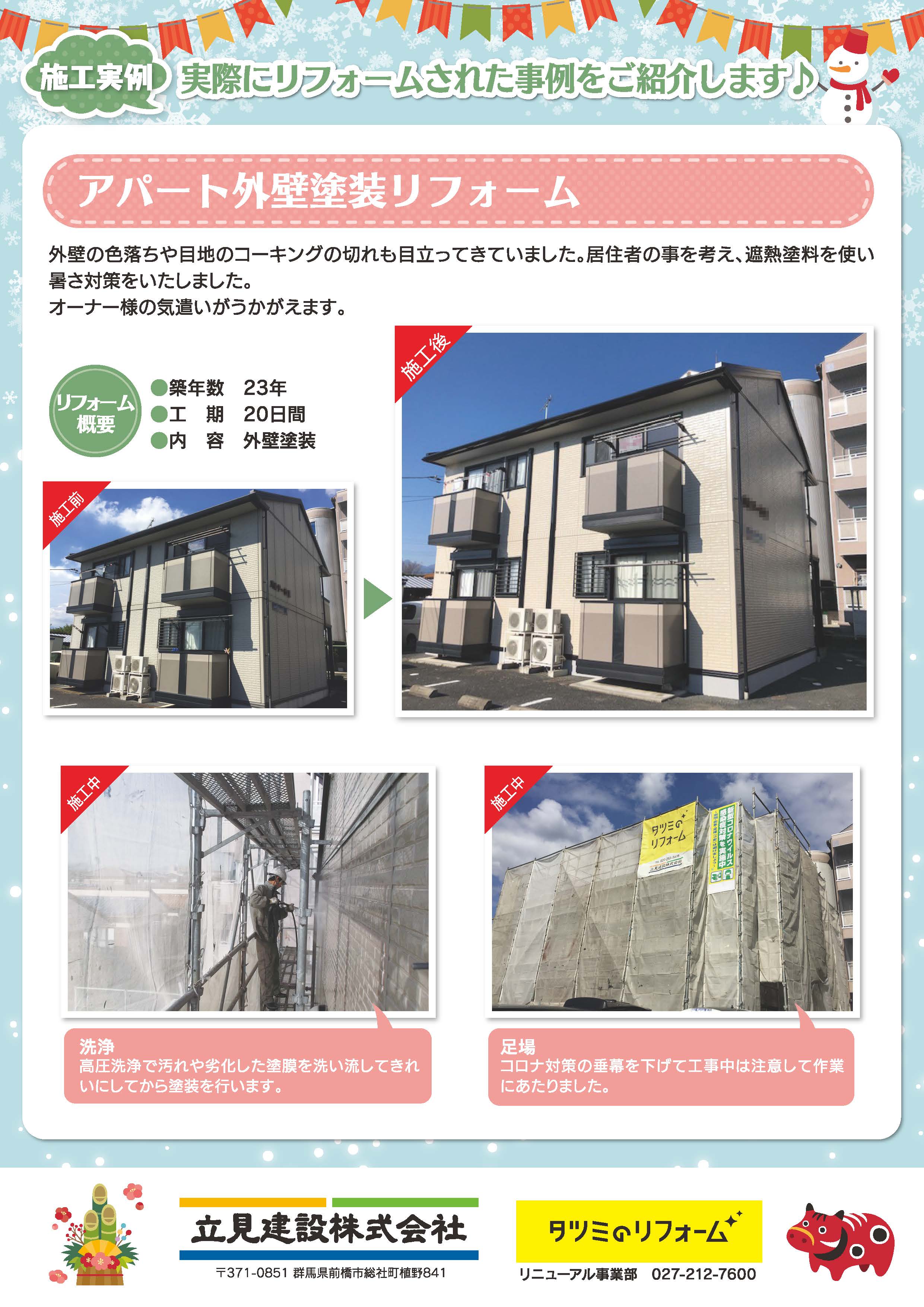 2020 12.24 リフォーム通信2020冬号を発行しました。 リフォーム通信2020冬号を発行しました。 ~内容~ ◇冬到来! 給湯器の故障にご注意! ◇火災警報器の電池切れにご注意 ◇新型コロナウイルスの感染予防の取り組み ◇年末年始休業のお知らせ ◇施工実例(アパート外壁塗装リフォーム) これからリフォームを検討されている方のご参考となる内容はもちろん、立見建設のタツミのリフォームに興味をもっていただいている皆様に楽しくお読みいただける内容となっております。 是非ご覧ください。