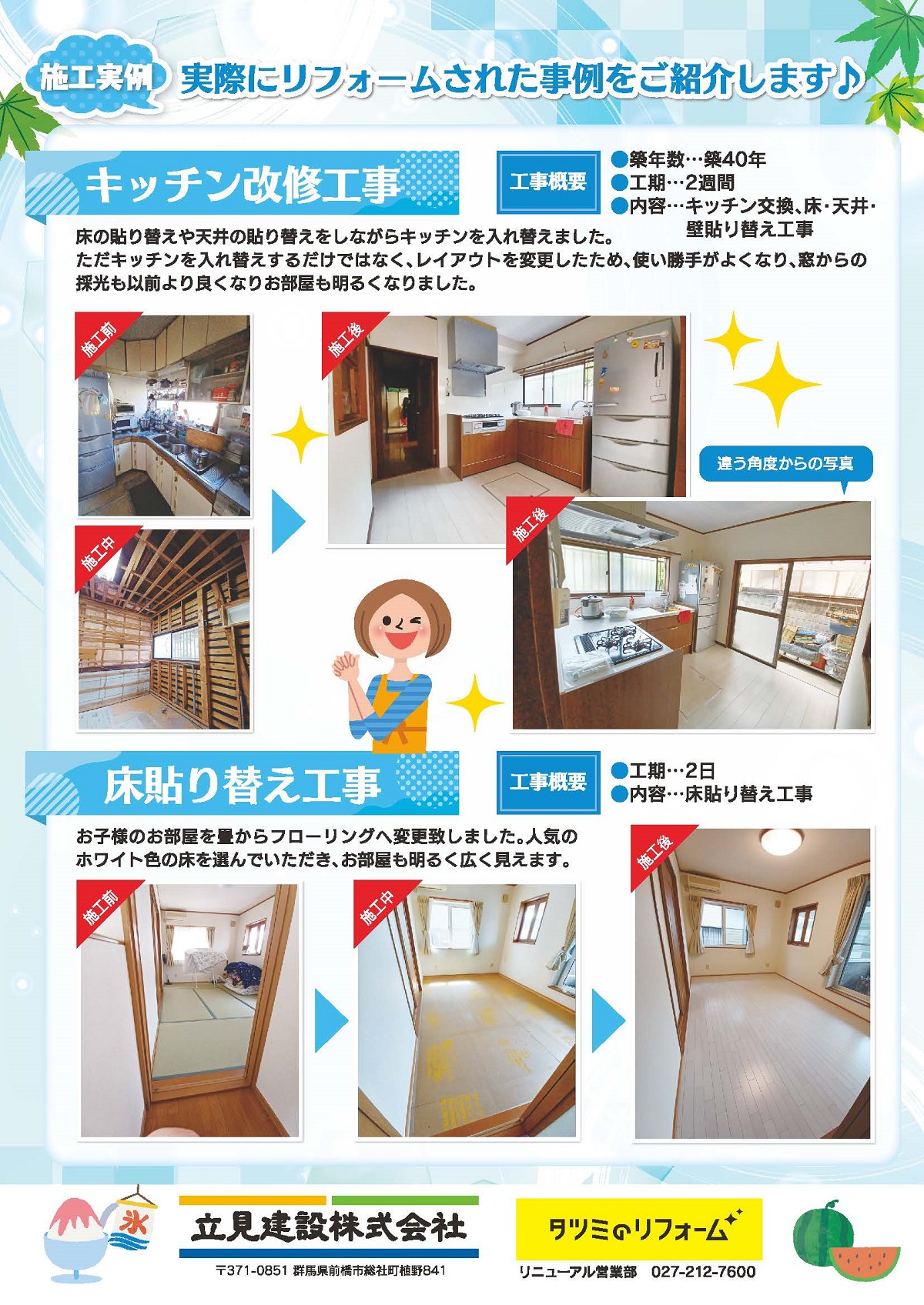 2023 07.27 リフォーム通信2023夏号を発行しました。 リフォーム通信2023夏号を発行しました。 ~内容~ ◇今年も開催いたします!エアコン取付キャンペーン ◇まだまだ間に合う!住宅省エネ2023キャンペーン ◇2023年群馬県内花火大会情報 ◇夏期休業のお知らせ ◇施工実例 これからリフォームを検討されている方のご参考となる内容はもちろん、立見建設のタツミのリフォームに興味をもっていただいている皆様に楽しくお読みいただける内容となっております。 是非ご覧ください。